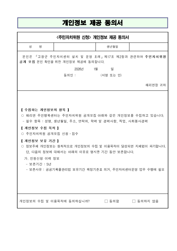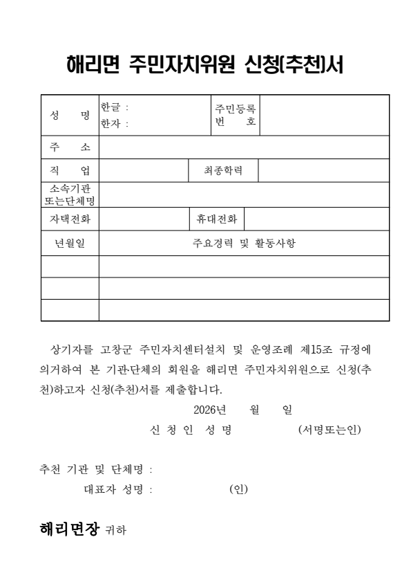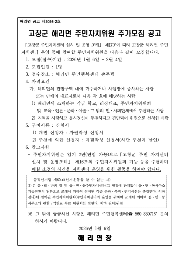 고창군 2026년도 해리면 주민자치위원 추가 모집