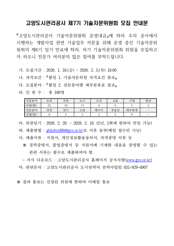 고양도시관리공사 제7기 기술자문위원회 모집
