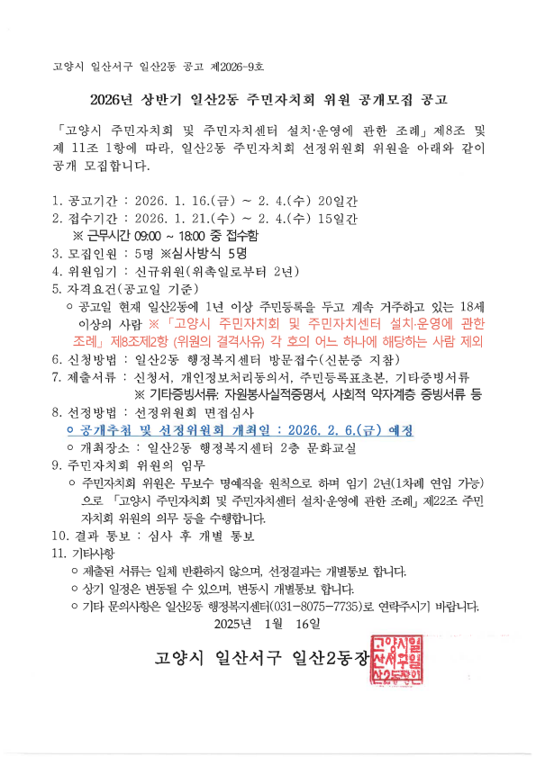 고양시 2026년 상반기 일산2동주민자치회 위원 공개모집