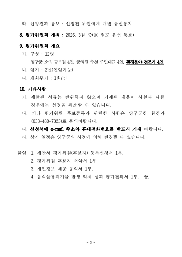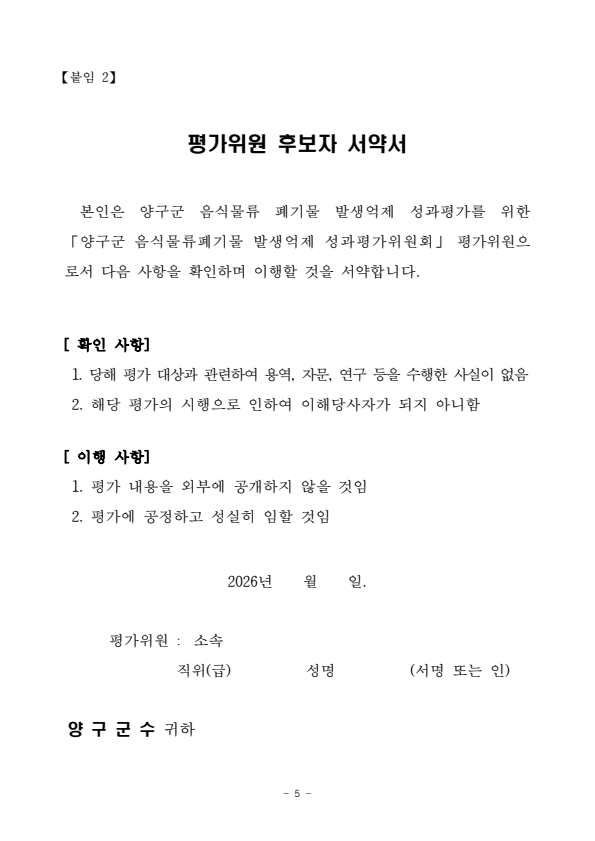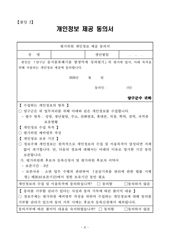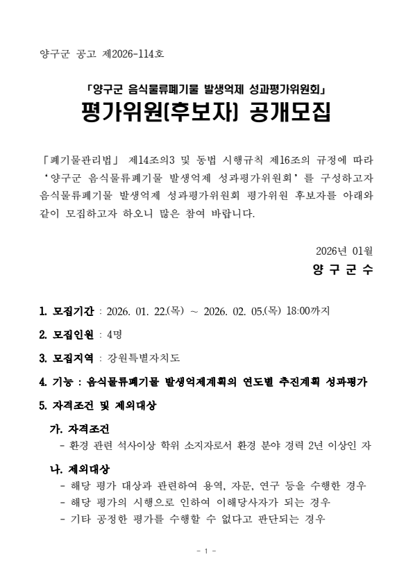 양구군 음식물류폐기물 발생억제 성과평가위원회 평가위원(후보자) 공개