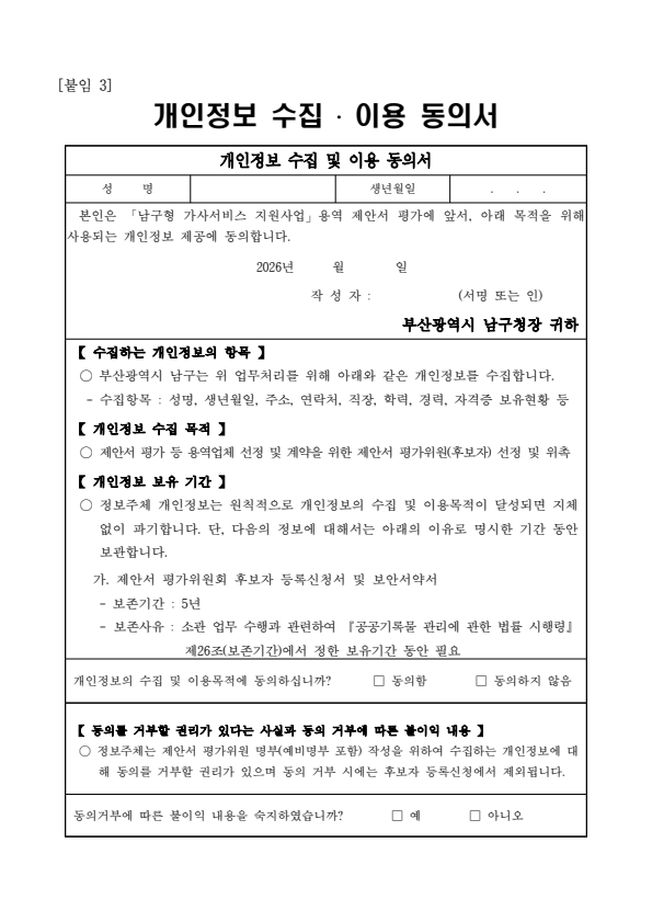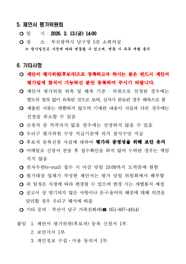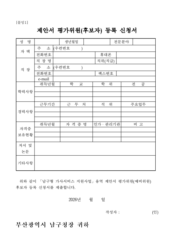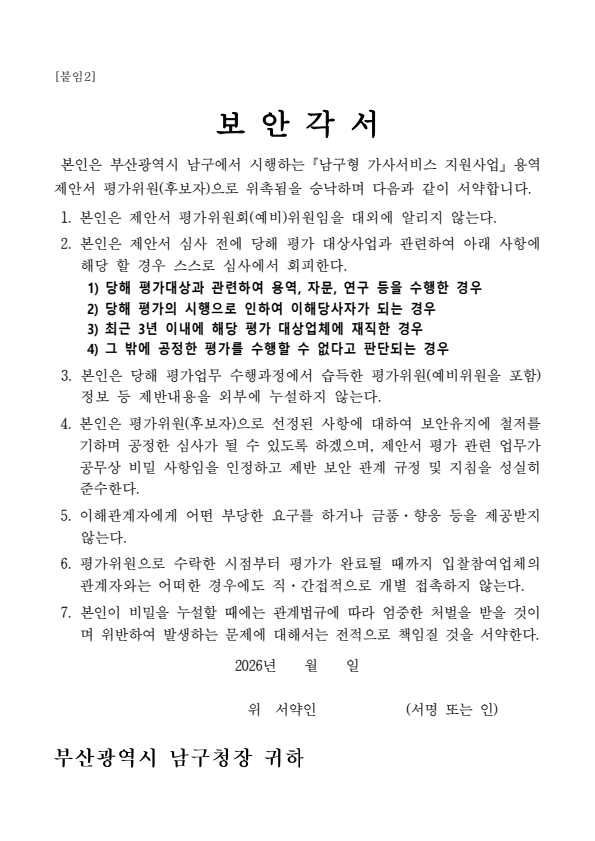 부산광역시 남구 남구형 가사서비스 지원사업 용역 제안서 평가위원(후보자) 모집