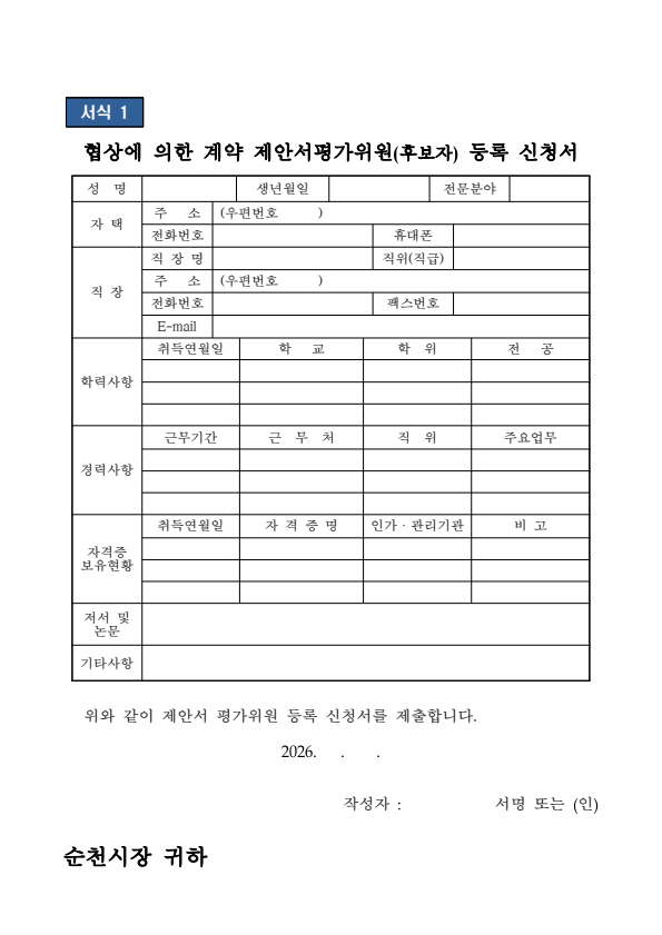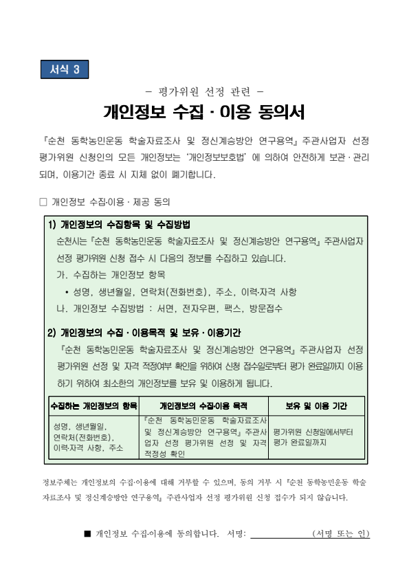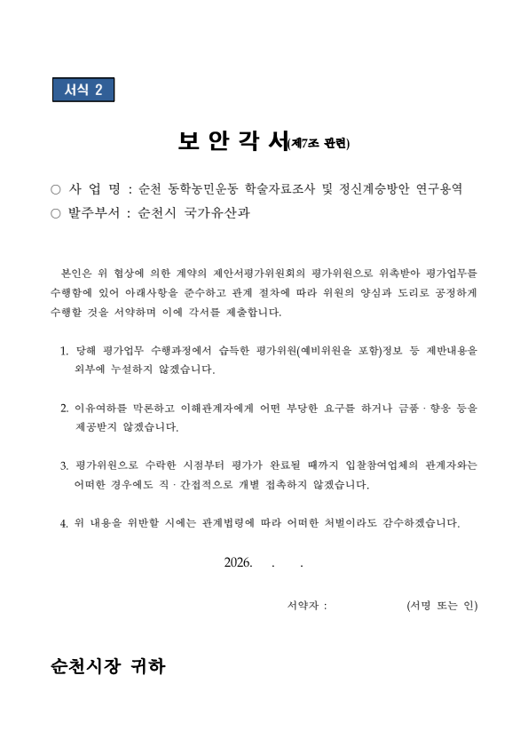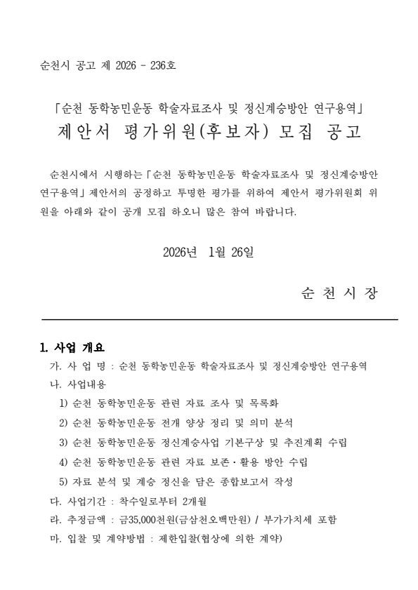 순천시 순천 동학농민운동 학술자료조사 및 정신계승방안 연구용역 제안서 평가위원(후보자) 모집