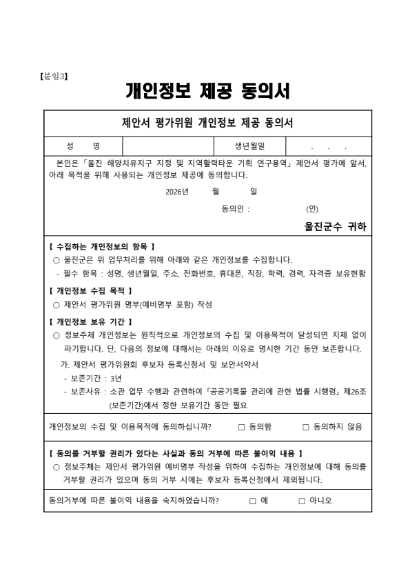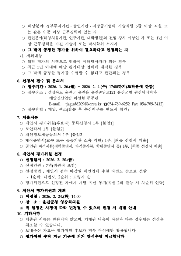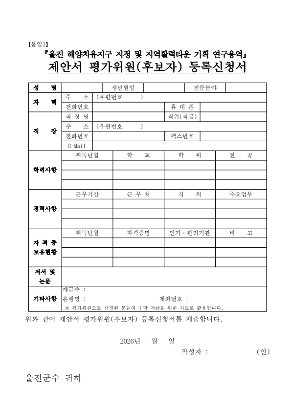 울진 해양치유지구 지정 및 지역활력타운 기획 연구용역 제안서 예비평가위원 모집