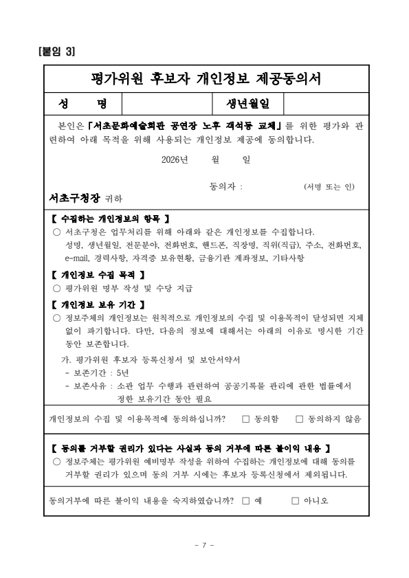 위원풀 구성 요청 기관 이름, 생년월일, 나이, 주소, 이메일, 휴대폰번호, 사진, 경력, 이력, 보유 자격증 중 제공받는 자와 제공협의한 항목 위원풀 구성원에 대한 선발 및 운영 안내 해당 공고의 선발 종료 시까지