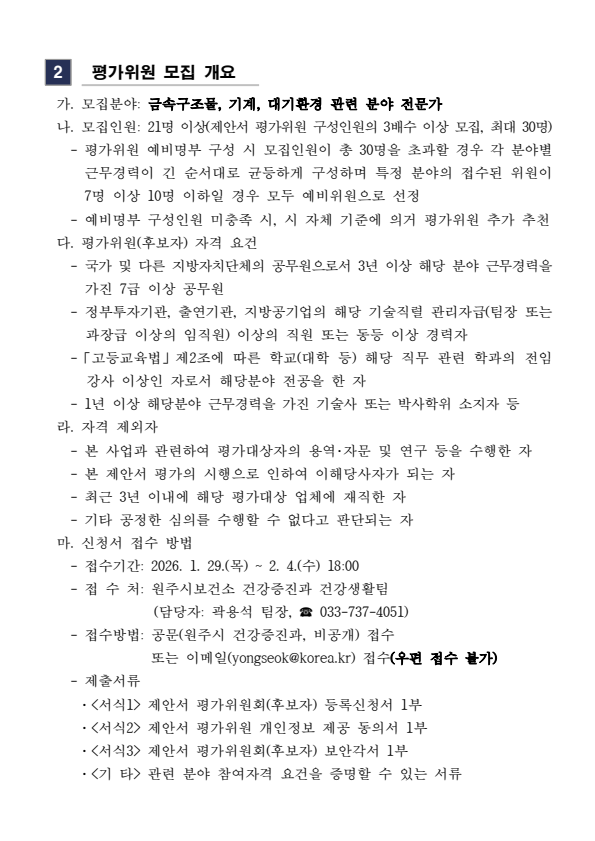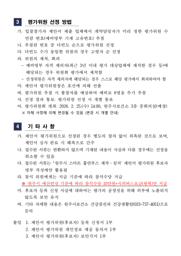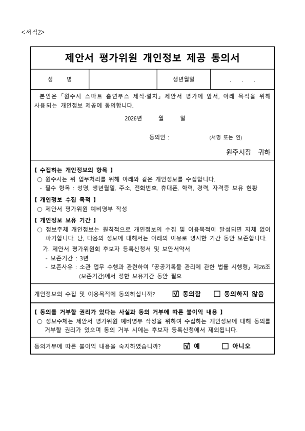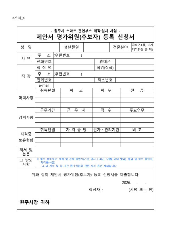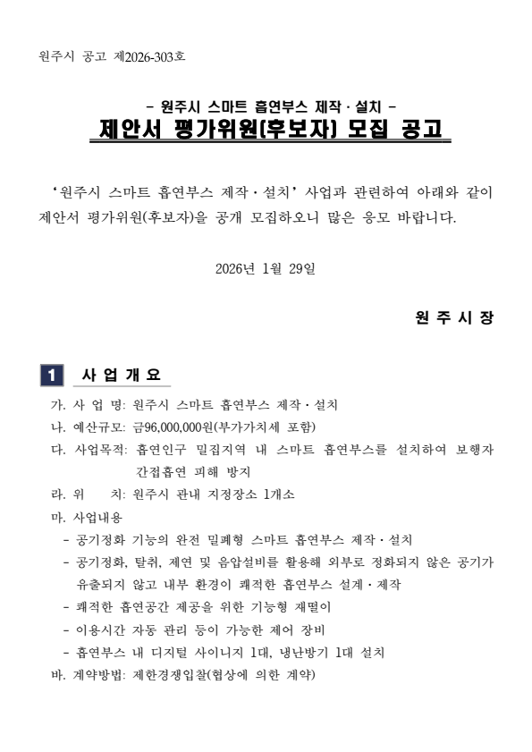원주시 스마트 흡연부스 제작 설치 제안서 평가위원(후보자) 모집
