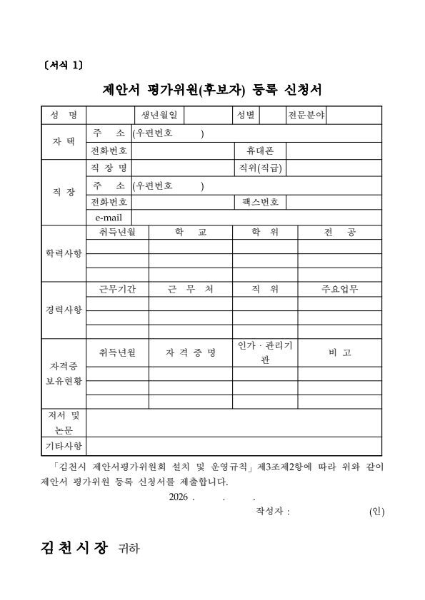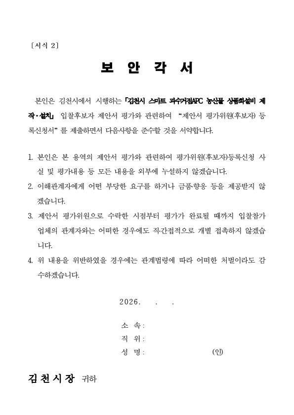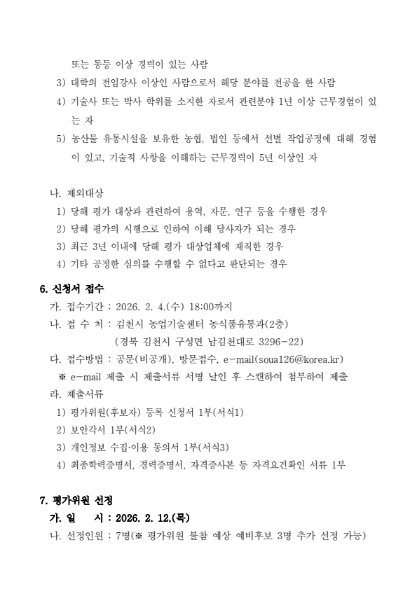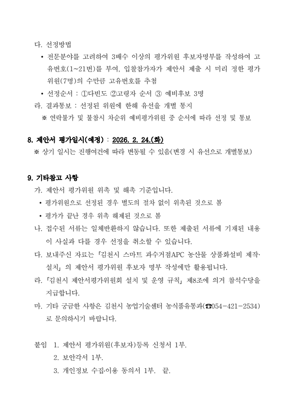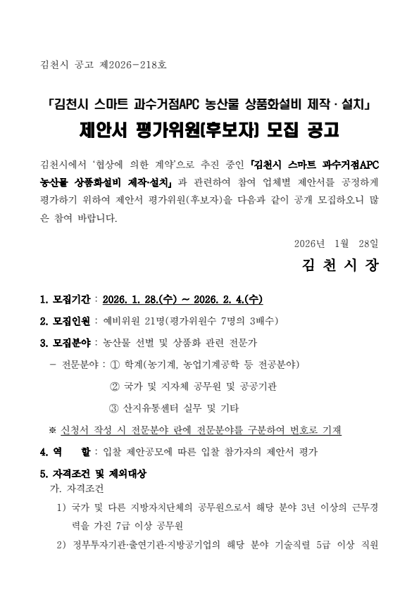 김천시 스마트 과수거점APC 농산물 상품화설비 제작・설치 제안서 평가위원(후보자) 모집