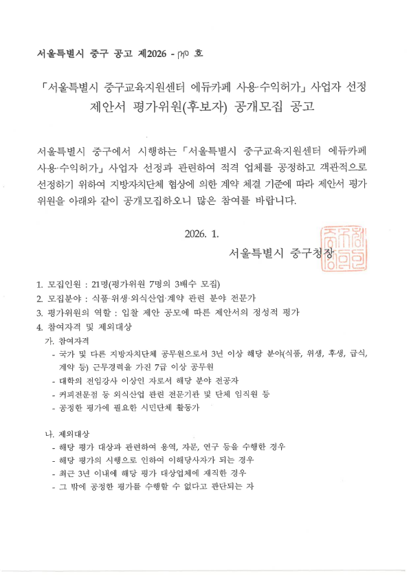 서울특별시 중구교육지원센터 에듀카페 사용 수익허가 사업자 선정 제안서평가위원(후보자) 공개모집