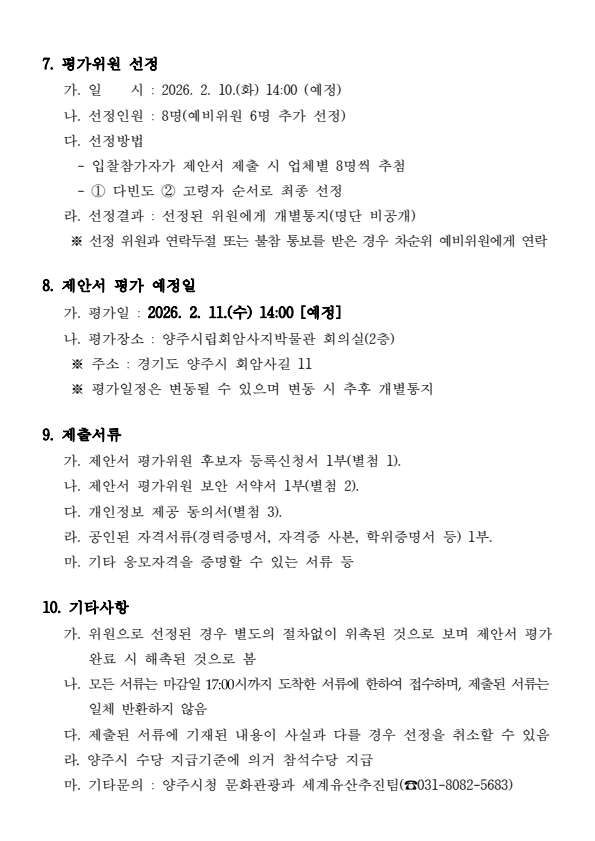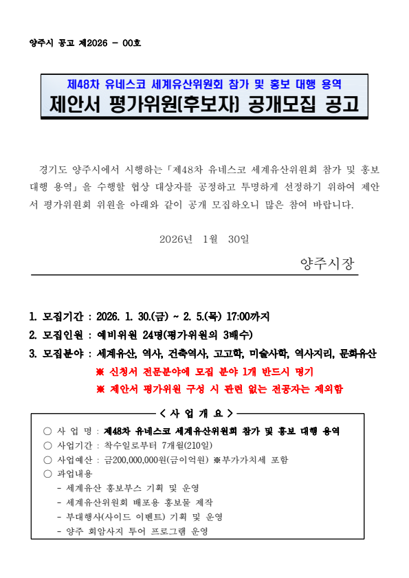 양주시 제48차 유네스코 세계유산위원회 참가 및 홍보 대행 용역 제안서 평가위원(후보자) 공개모집