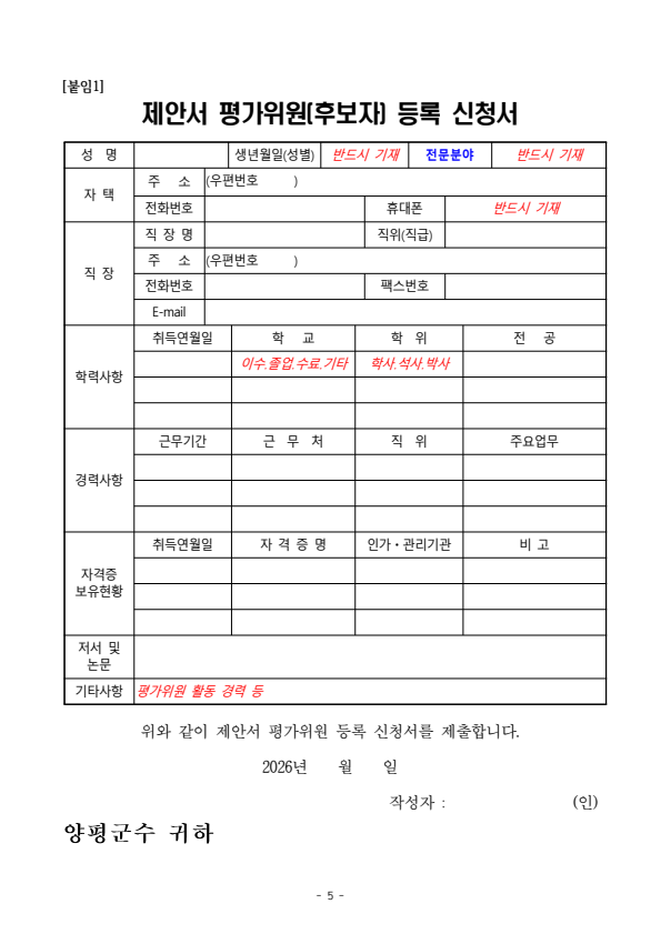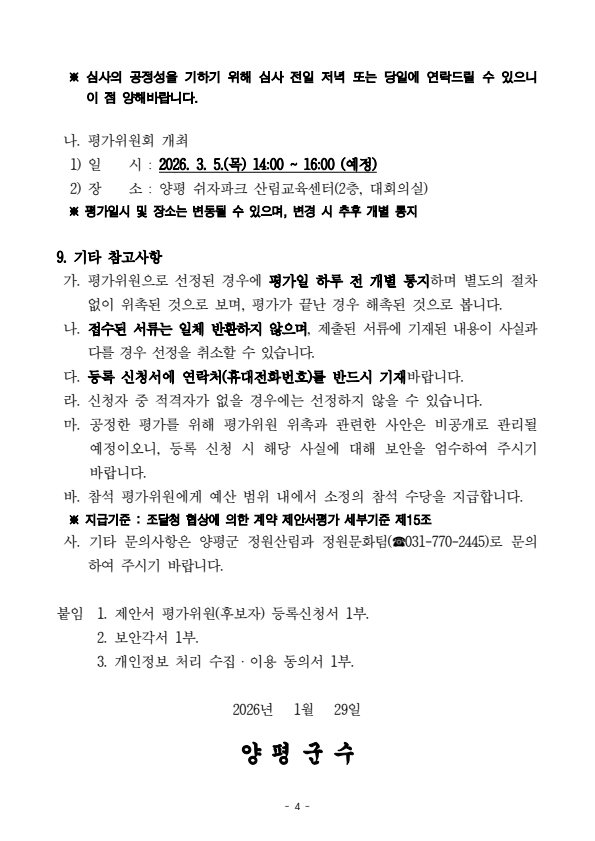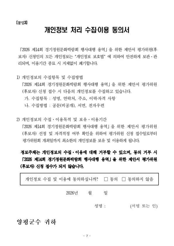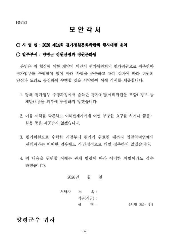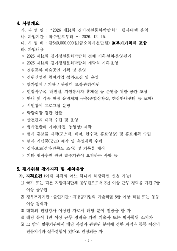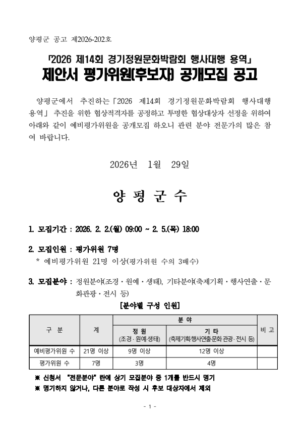 양평군 2026 제14회 경기정원문화박람회 행사대행 용역 제안서 평가위원(후보자) 공개모집