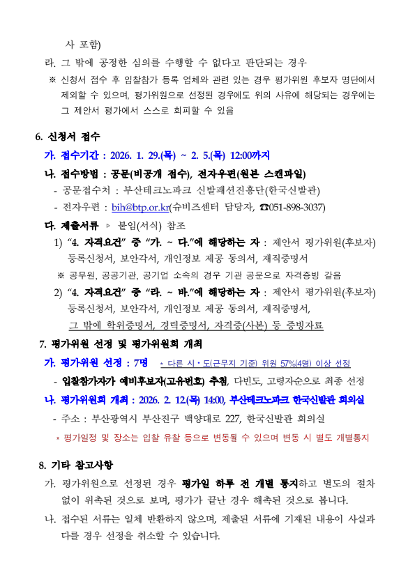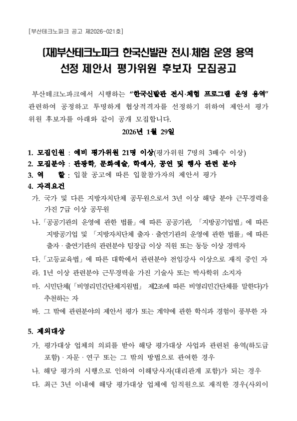 (재)부산테크노파크 한국신발관 전시·체험 운영 용역 선정 제안서 평가위원 후보자 모집