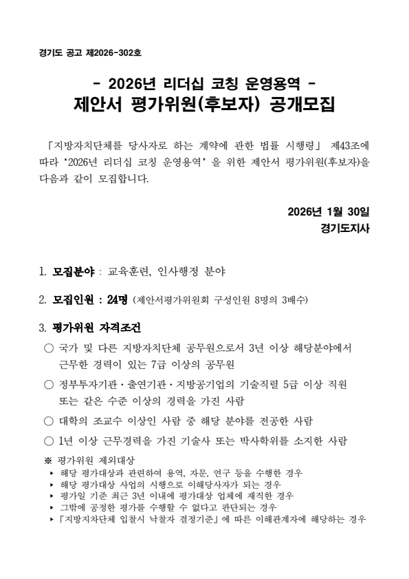 경기도 2026년 리더십 코칭 운영용역 제안서 평가위원(후보자) 공개모집