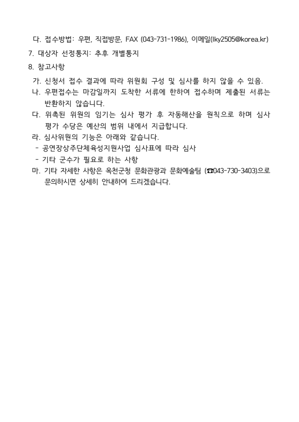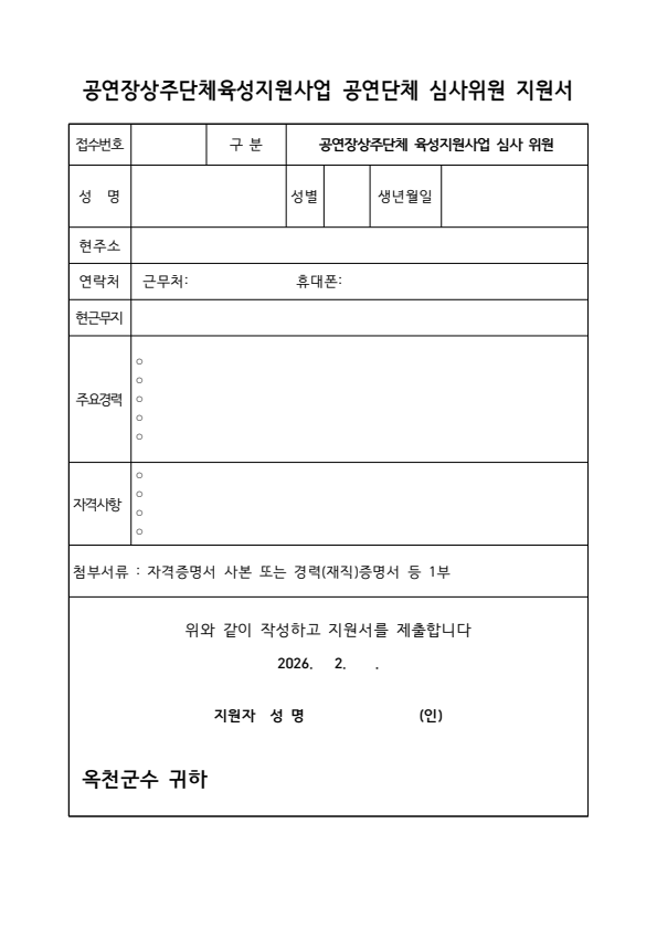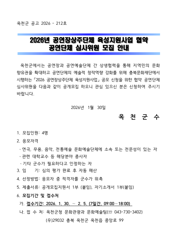 옥천군 2026년 공연장상주단체 육성지원사업 협약 공연단체 심사위원 모집