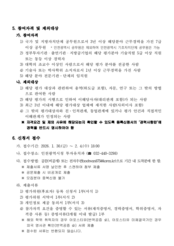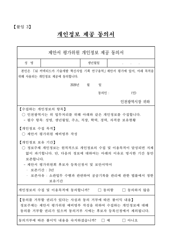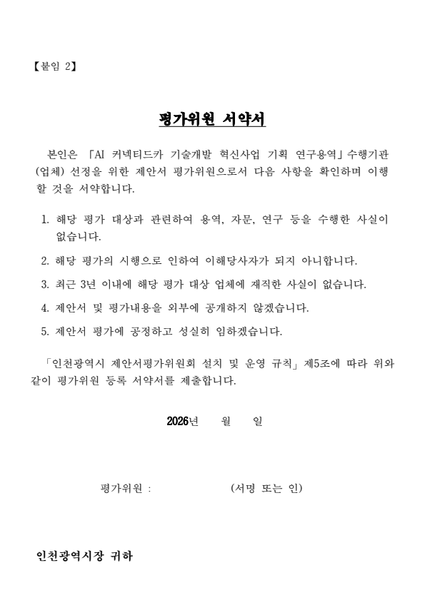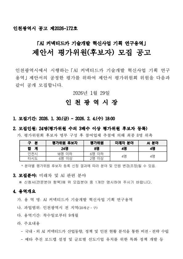 인천광역시 AI 커넥티드카 기술개발 혁신사업 기획 연구용역 제안서 평가위원(후보자) 모집