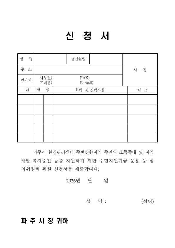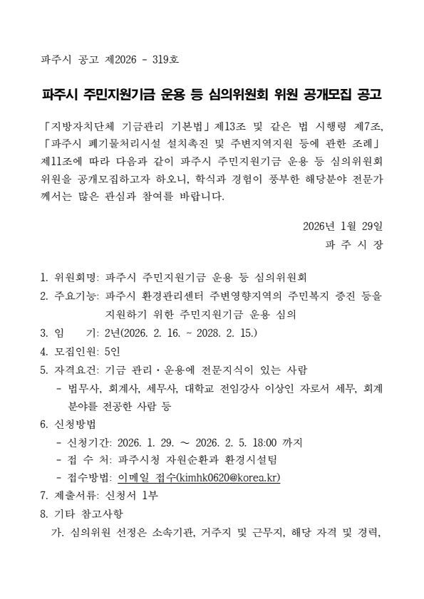 파주시 주민지원기금 운용 등 심의위원회 위원 공개모집