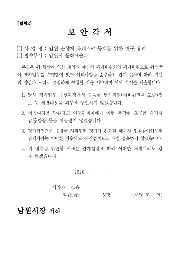 남원 춘향제 유네스코 등재를 위한 연구 용역 제안서 평가위원(후보자) 모집
