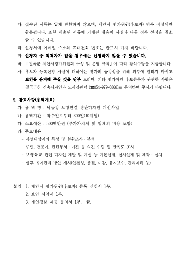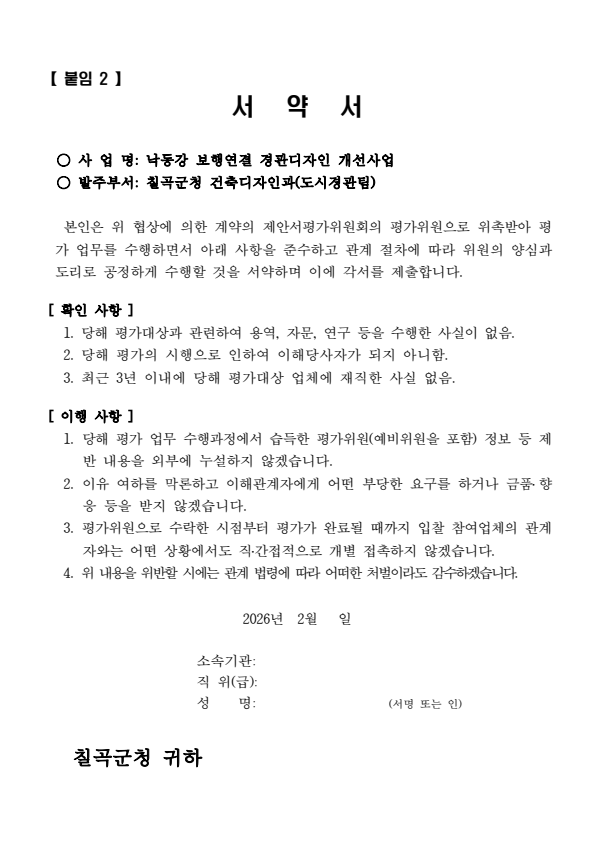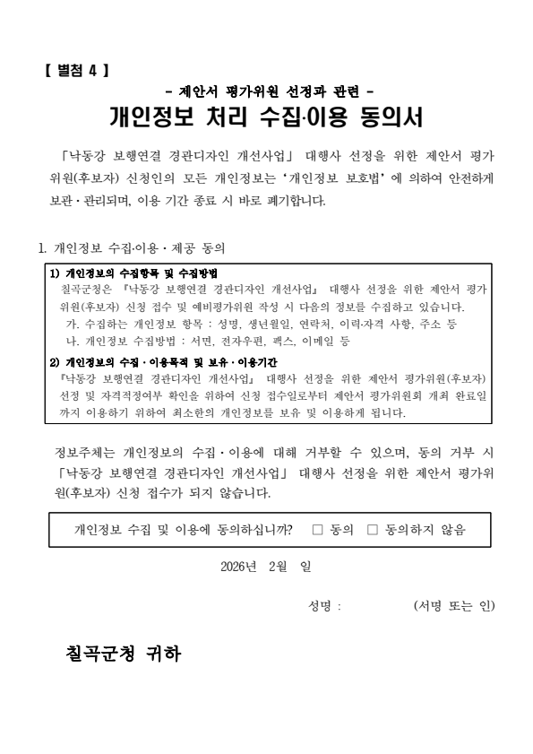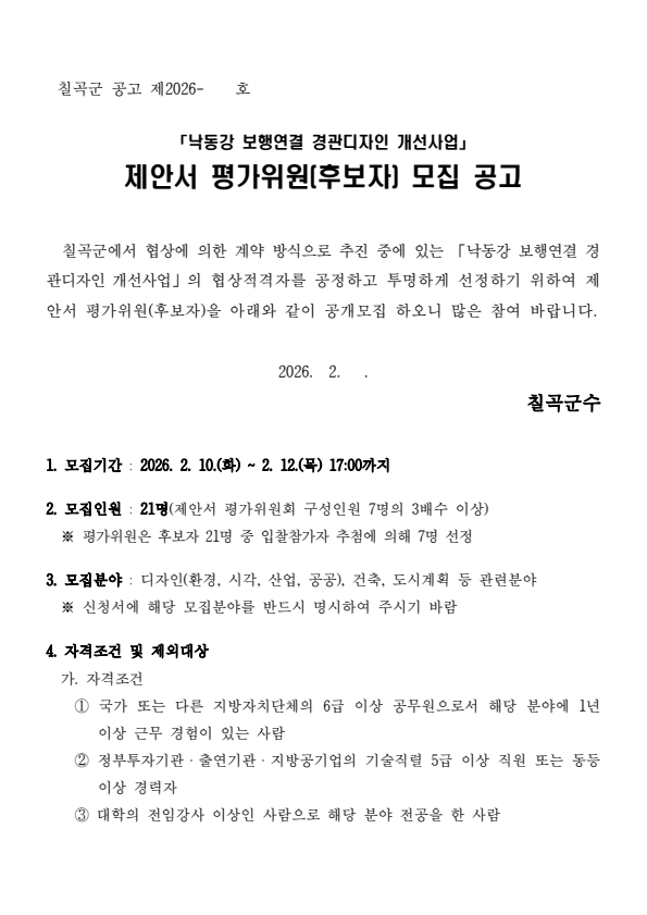 칠곡군 낙동강 보행연결 경관디자인 개선사업 제안서 평가위원(후보자) 공개모집