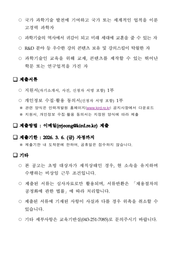 | 위원풀 구성 요청 기관 | 이름, 생년월일, 나이, 주소, 이메일, 휴대폰번호, 사진, 경력, 이력, 보유 자격증 중 제공받는 자와 제공협의한 항목 | 위원풀 구성원에 대한 선발 및 운영 안내 | 해당 공고의 선발 종료 시까지 |