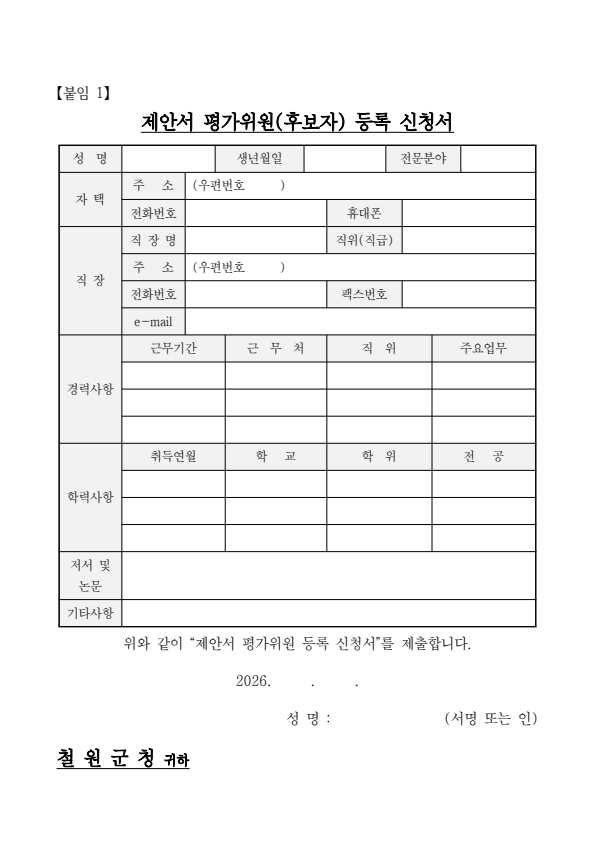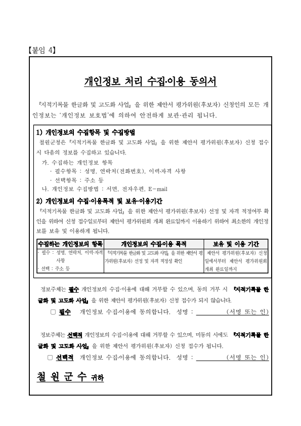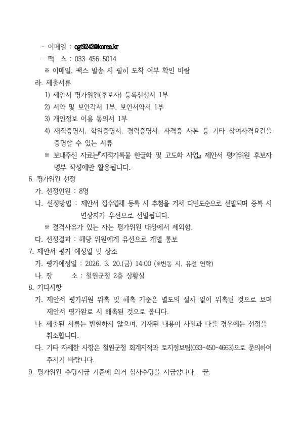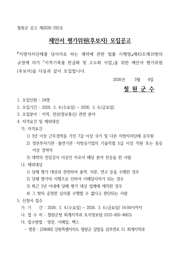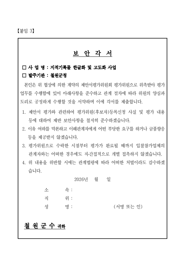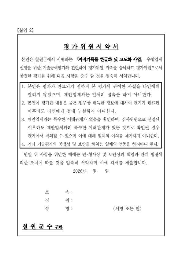 철원군 지적기록물 한글화 및 고도화 사업 제안서 평가위원(후보자) 모집