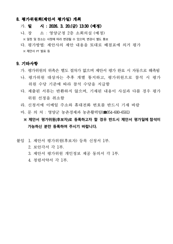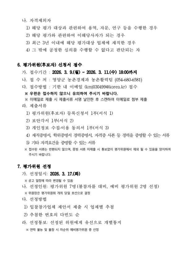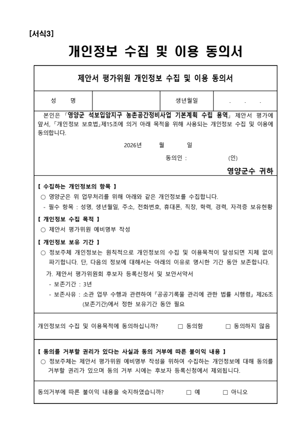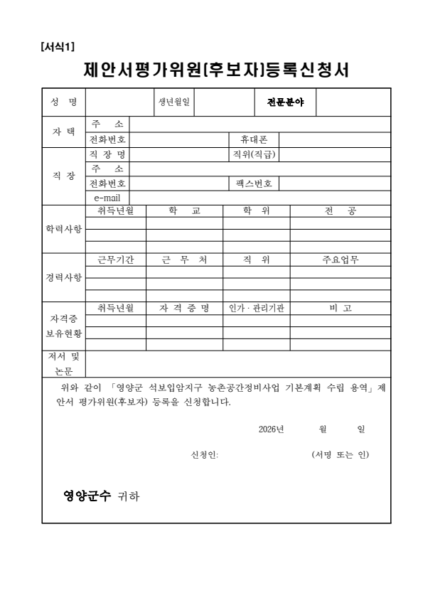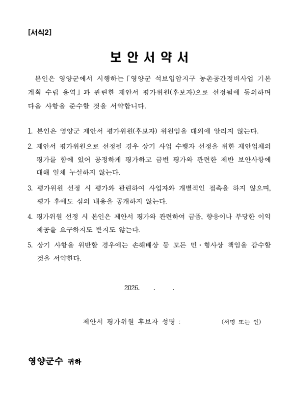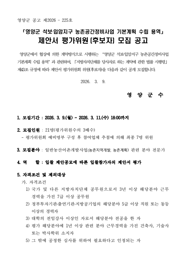 영양군 석보입암지구 농촌공간정비사업 기본계획 수립 용역 제안서 평가위원(후보자) 모집