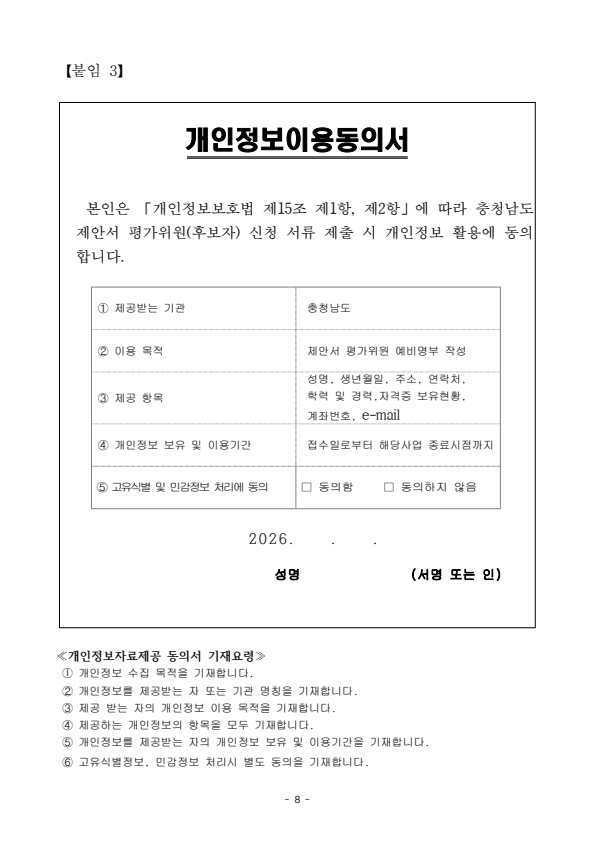 위원풀 구성 요청 기관 이름, 생년월일, 나이, 주소, 이메일, 휴대폰번호, 사진, 경력, 이력, 보유 자격증 중 제공받는 자와 제공협의한 항목 위원풀 구성원에 대한 선발 및 운영 안내 해당 공고의 선발 종료 시까지