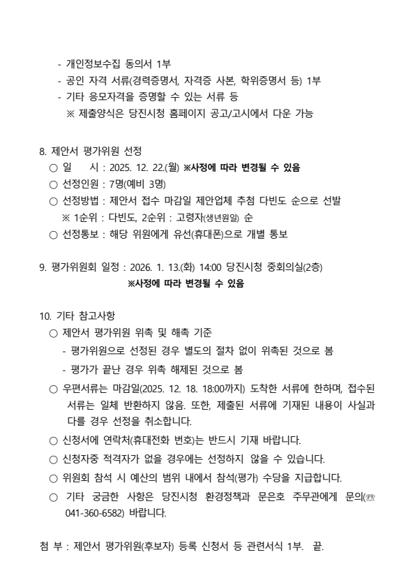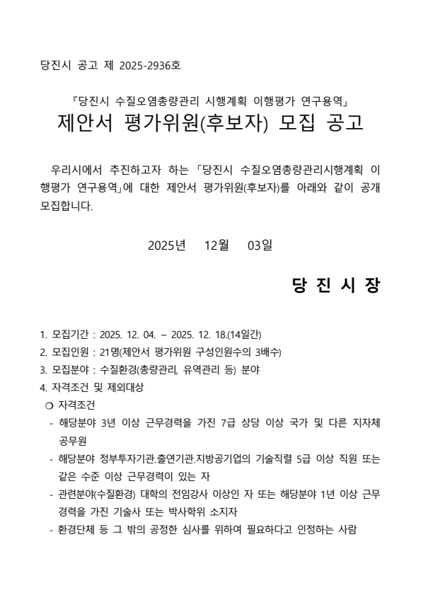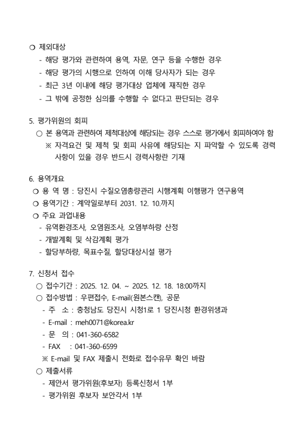 당진시 수질오염총량관리 시행계획 이행평가 연구용역 제안서 평가위원 모집