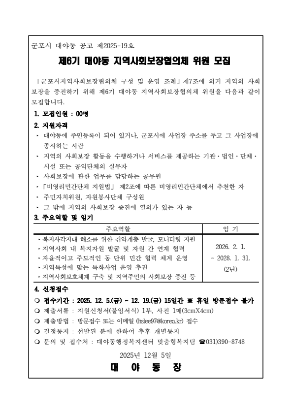 군포시 제6기 대야동 지역사회보장협의체 위원 모집