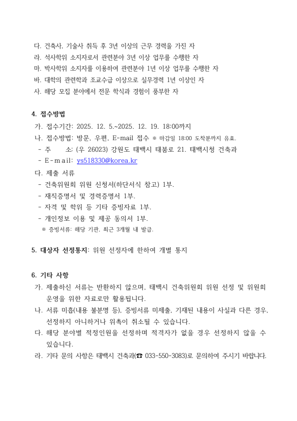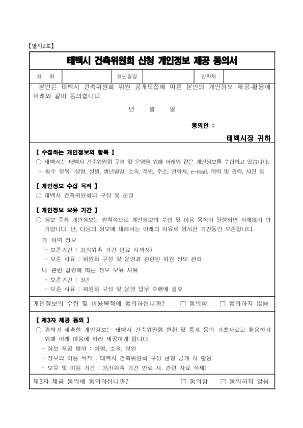 위원풀 구성 요청 기관 이름, 생년월일, 나이, 주소, 이메일, 휴대폰번호, 사진, 경력, 이력, 보유 자격증 중 제공받는 자와 제공협의한 항목 위원풀 구성원에 대한 선발 및 운영 안내 해당 공고의 선발 종료 시까지