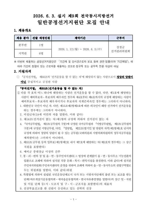 산청군선거관리위원회 제9회 전국동시지방선거 일반공정선거지원단 모집