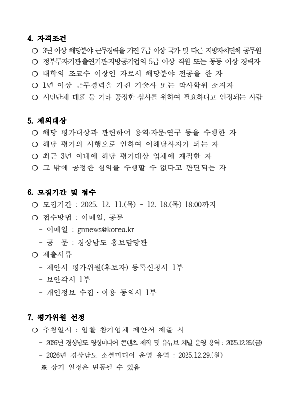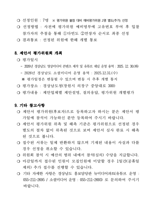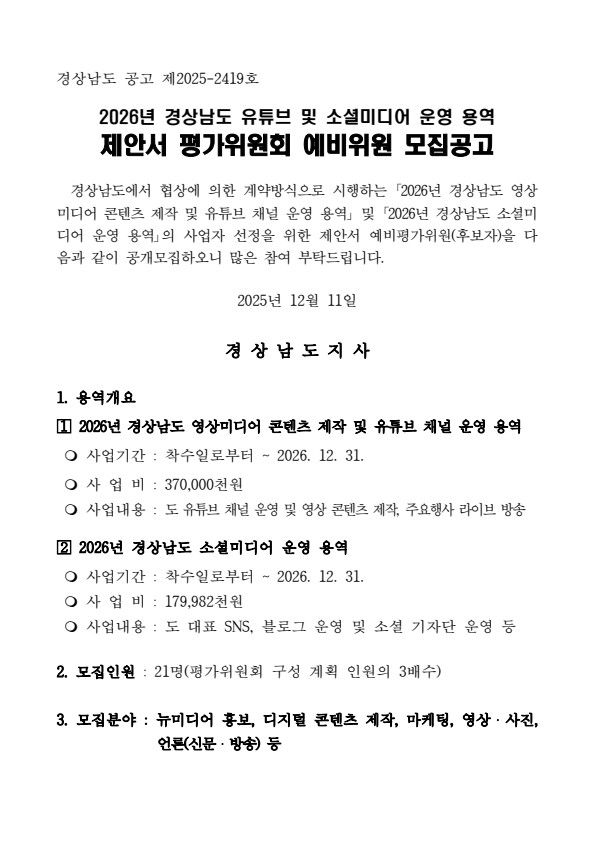 2026년 경상남도 유튜브 및 소셜미디어 운영 용역 관련 제안서 평가위원회 예비위원 모집