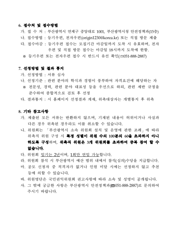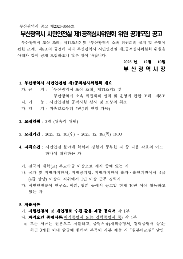 부산광역시 시민안전실 제1공적심사위원회 위원 공개모집