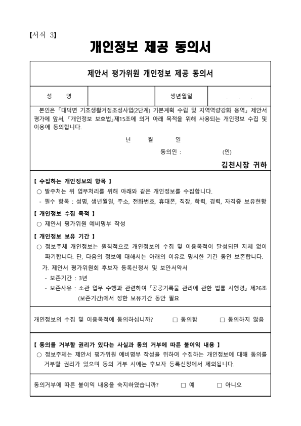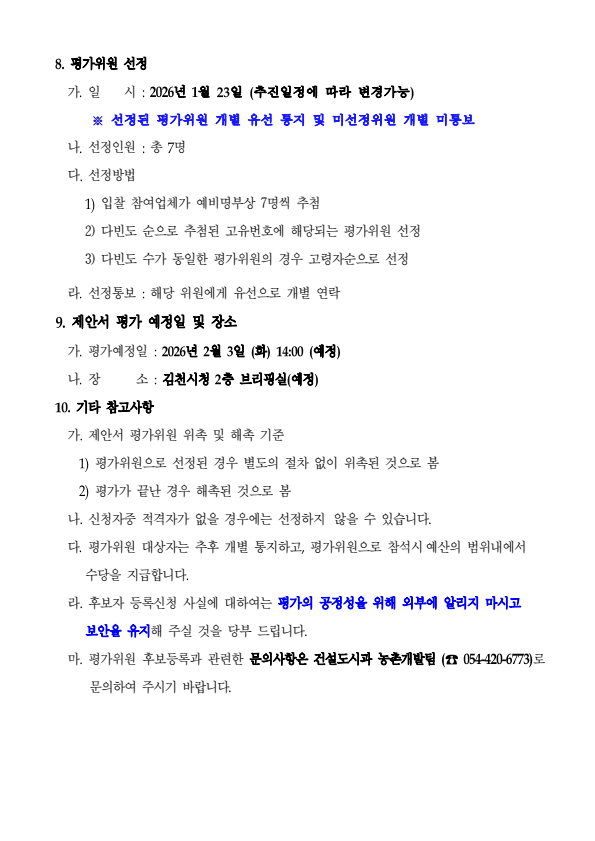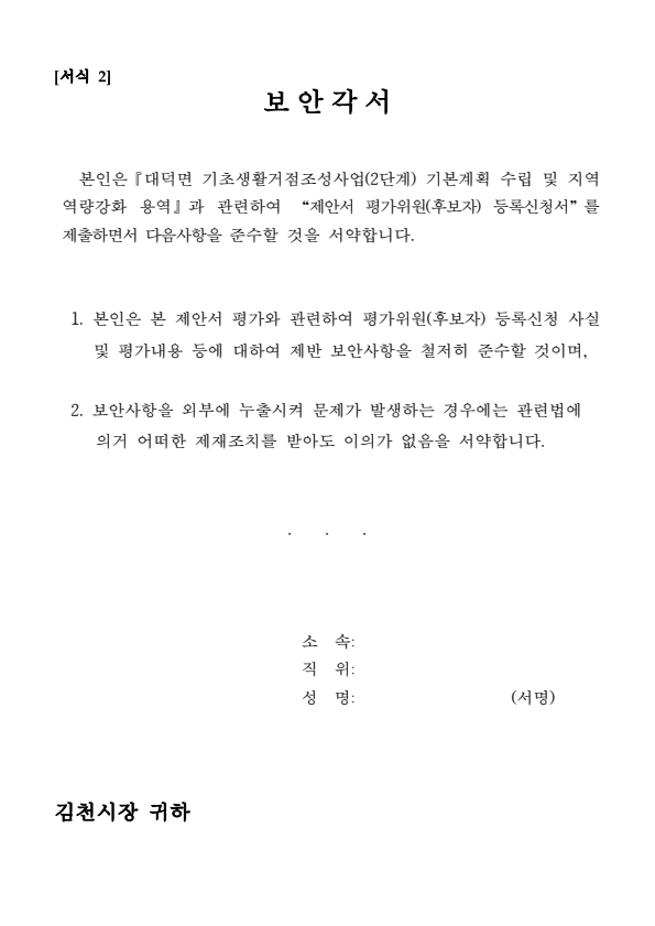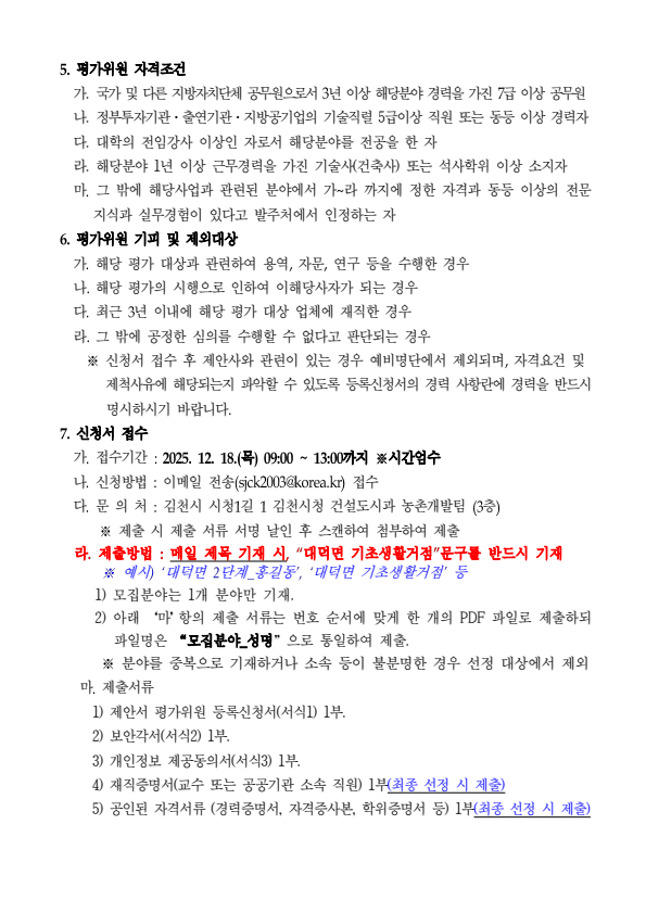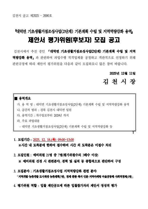 김천시 대덕면 기초생활거점조성사업(2단계) 기본계획 수립 및 지역역량강화 용역 제안서 평가위원(후보자) 모집