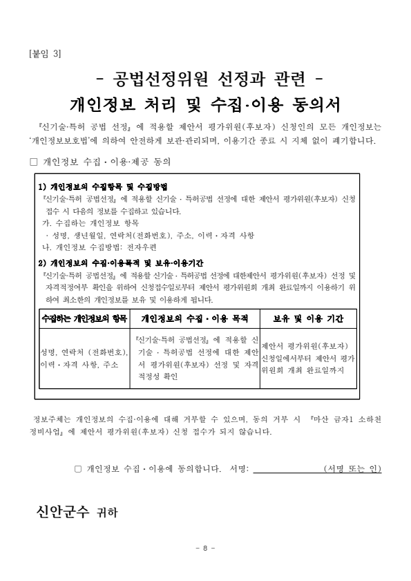 위원풀 구성 요청 기관 이름, 생년월일, 나이, 주소, 이메일, 휴대폰번호, 사진, 경력, 이력, 보유 자격증 중 제공받는 자와 제공협의한 항목 위원풀 구성원에 대한 선발 및 운영 안내 해당 공고의 선발 종료 시까지