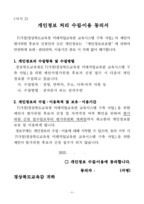 맞춤형 모집 공고 및 프로그램 추천 예측을 위한 연구 인공지능 학습 데이터 수집 및 추천 알고리즘 개발 이름, 생년월일, 성별, 나이, 주소, 이메일, 휴대폰번호, 팩스, 사진, 학력, 경력, 이력, 보유 자격증, 위원 활동사항 연구목적 달성시까지