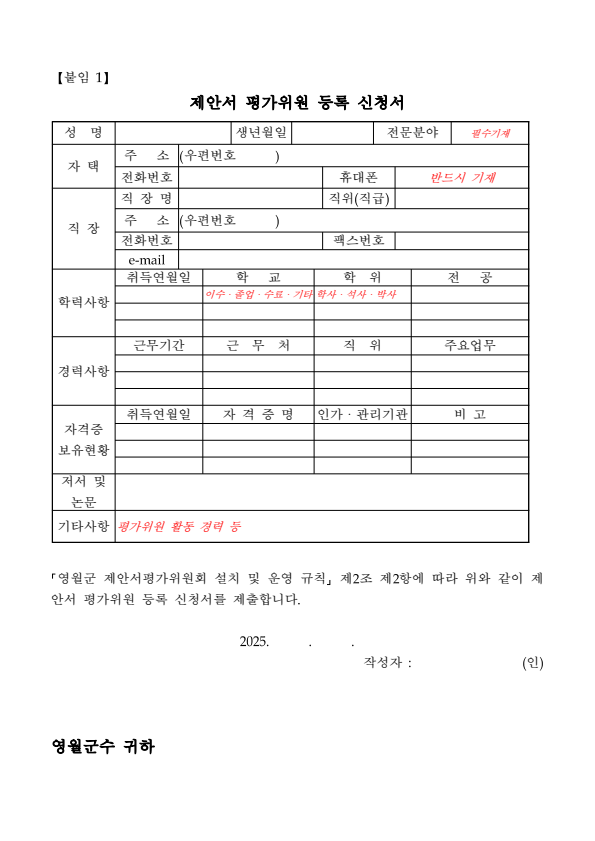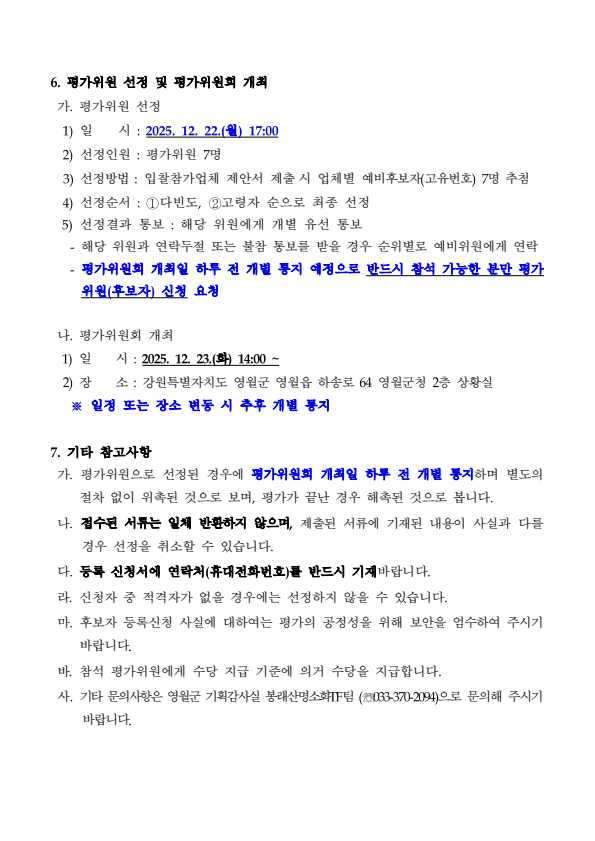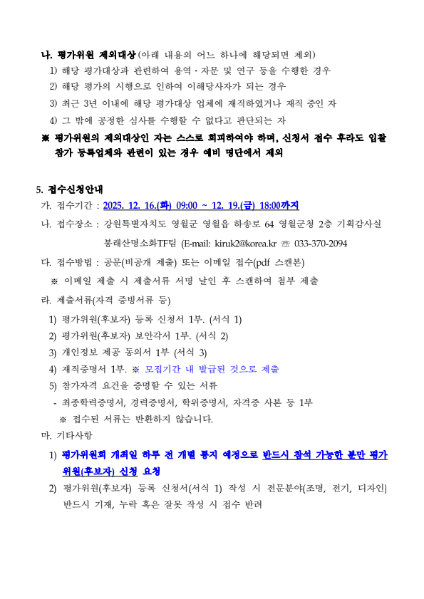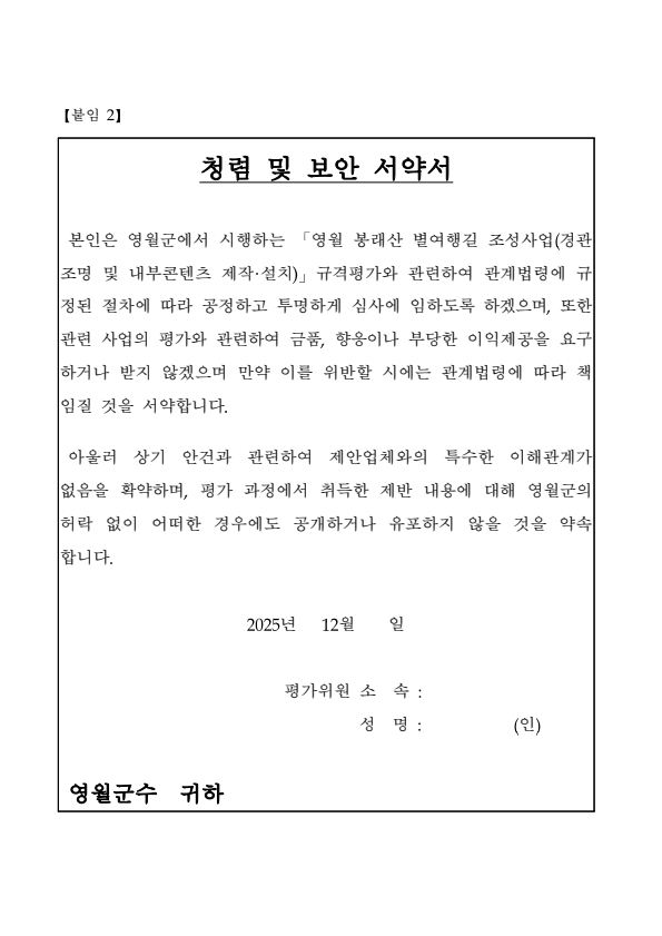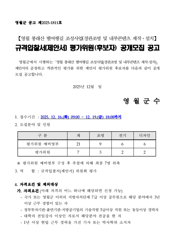 영월군 영월 봉래산 별여행길 조성사업 규격입찰서(제안서) 평가위원 공개 모집