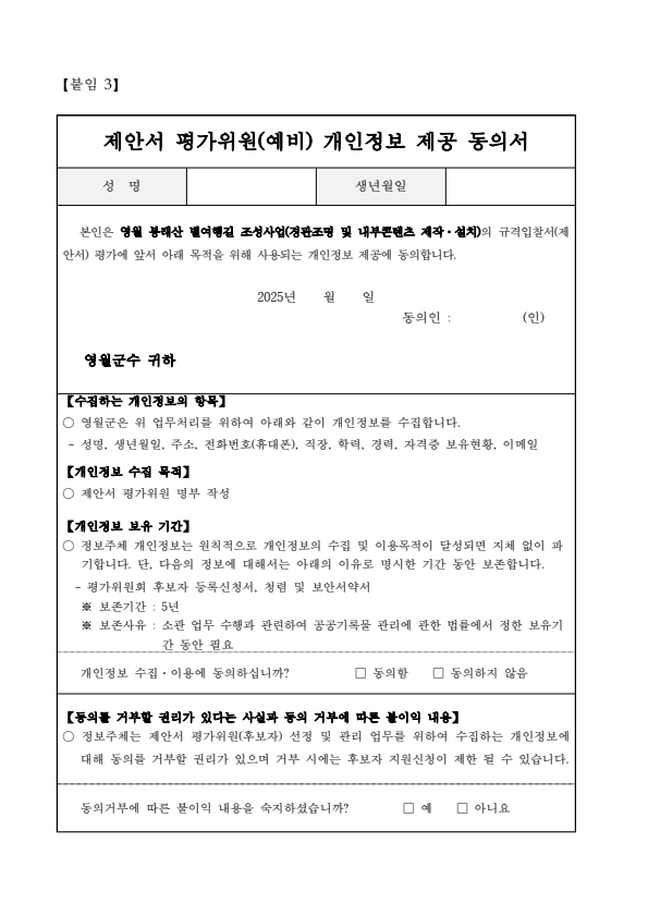 위원풀 구성 요청 기관 이름, 생년월일, 나이, 주소, 이메일, 휴대폰번호, 사진, 경력, 이력, 보유 자격증 중 제공받는 자와 제공협의한 항목 위원풀 구성원에 대한 선발 및 운영 안내 해당 공고의 선발 종료 시까지