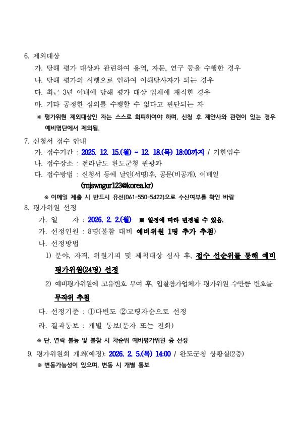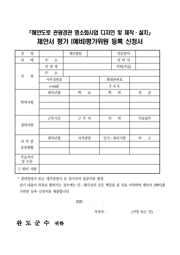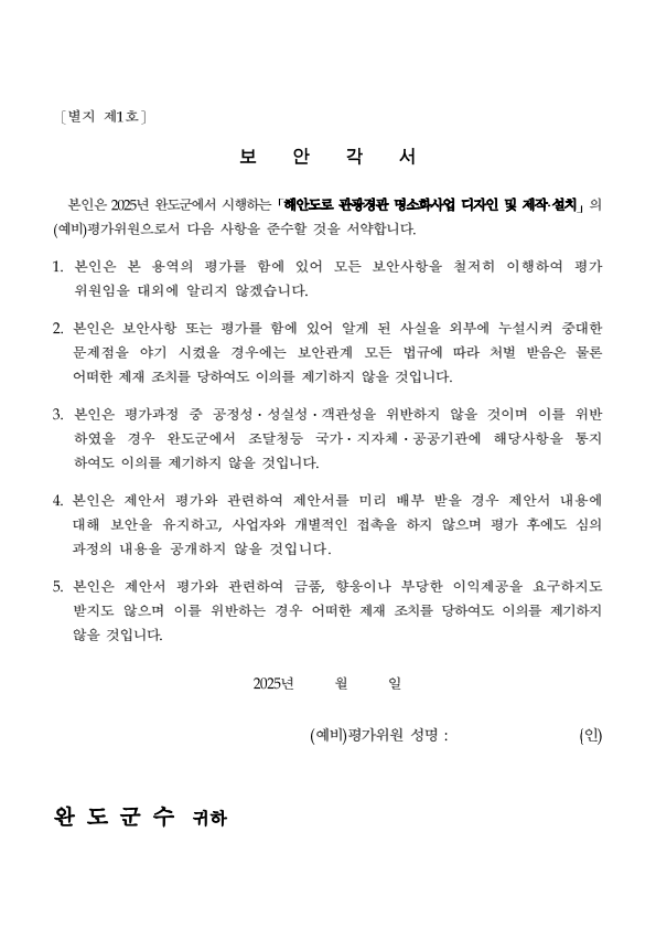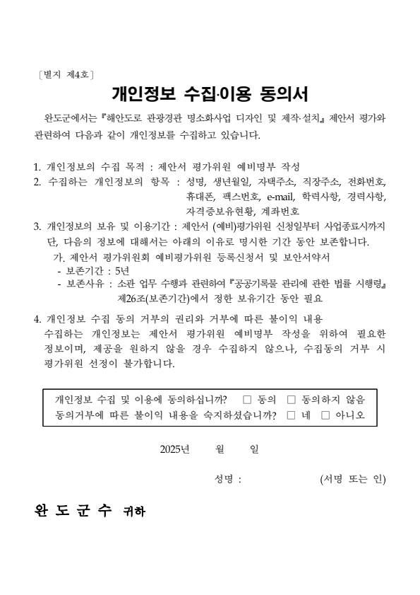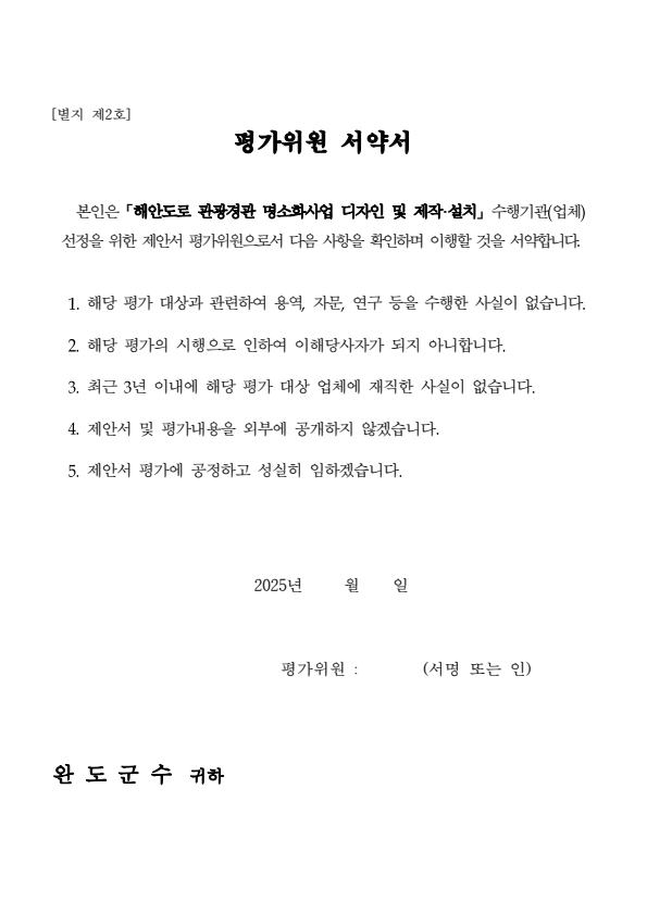 완도군 해안도로 관광경관 명소화사업 디자인 및 제작설치 제안서 (예비)평가위원 모집