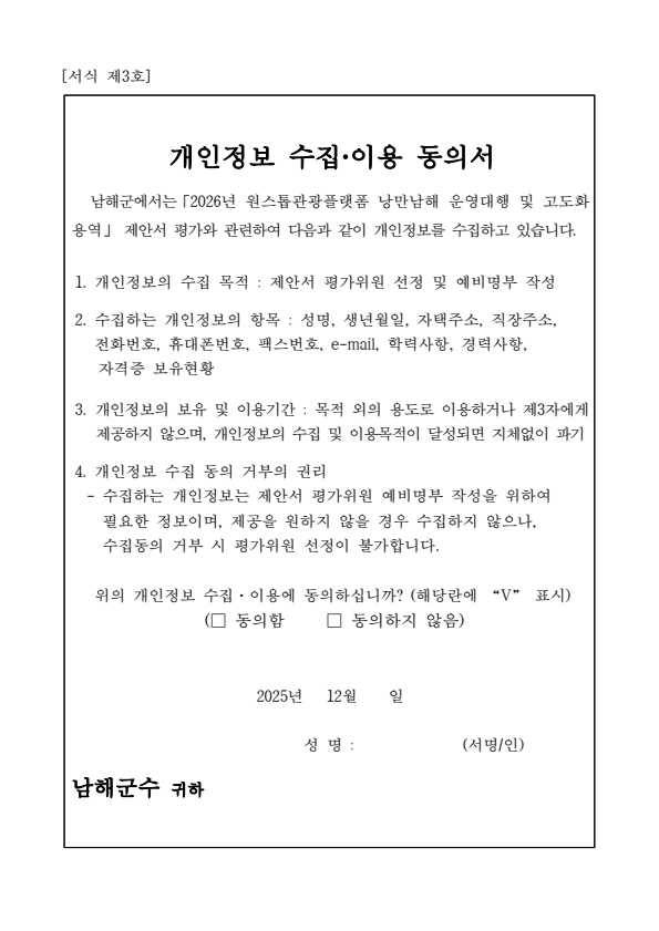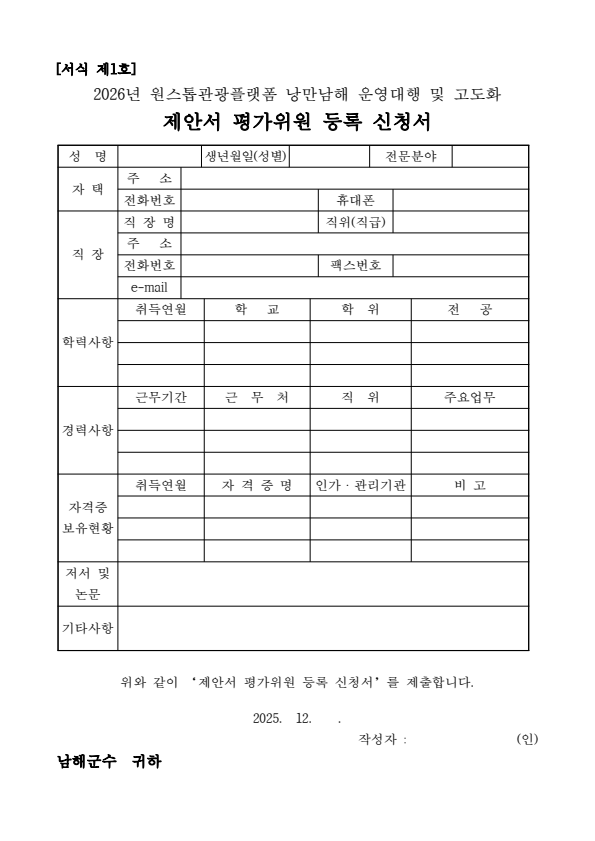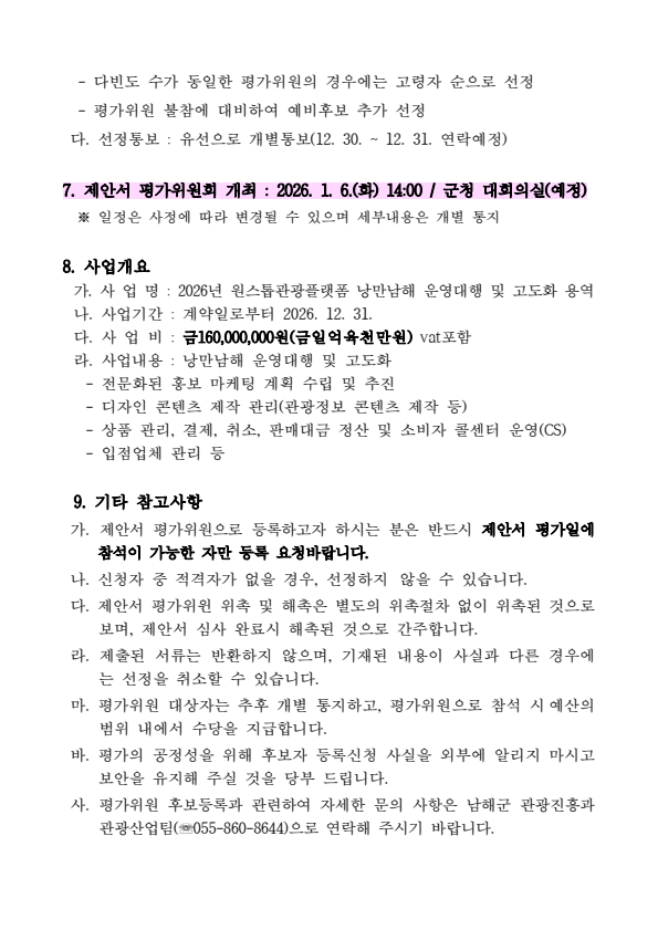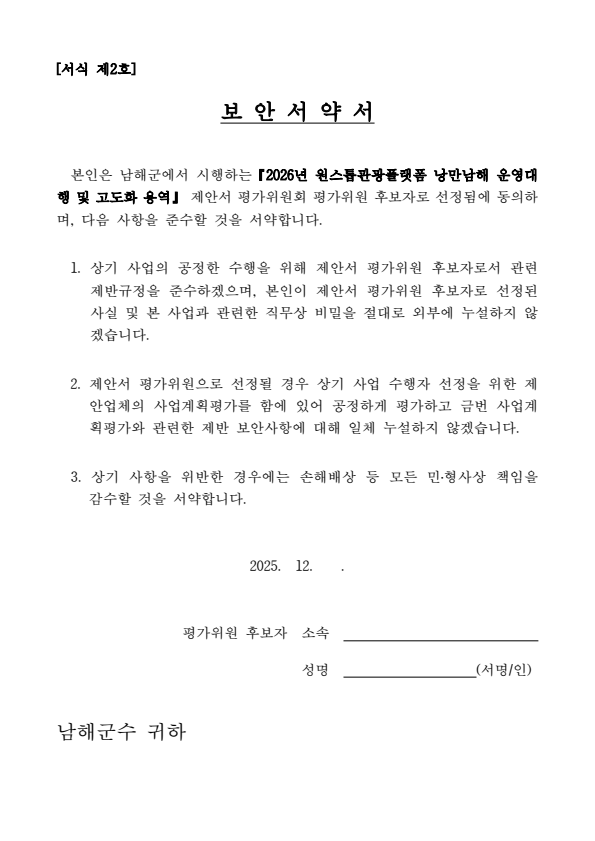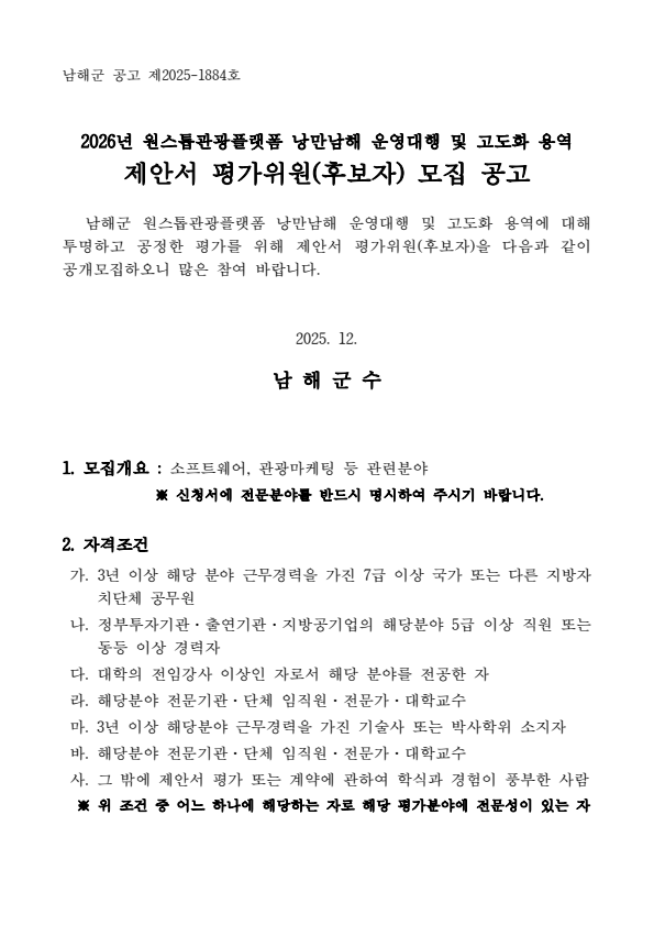 남해군 원스톱관광플랫폼 낭만남해 운영대행 및 고도화 용역 제안서 평가위원(후보자) 공개모집