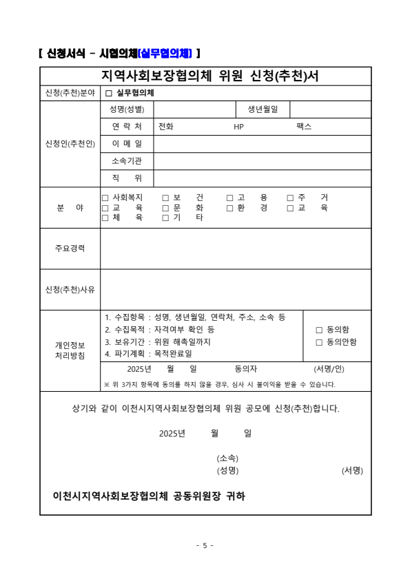 맞춤형 모집 공고 및 프로그램 추천 예측을 위한 연구 인공지능 학습 데이터 수집 및 추천 알고리즘 개발 이름, 생년월일, 성별, 나이, 주소, 이메일, 휴대폰번호, 팩스, 사진, 학력, 경력, 이력, 보유 자격증, 위원 활동사항 연구목적 달성시까지